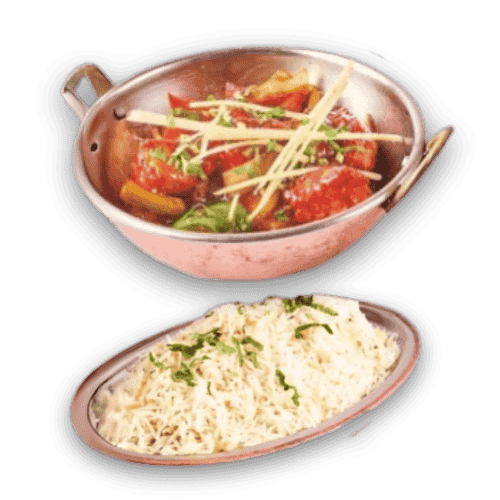 Sterk kryderede kylling biter med chili-aroma og curry saus serveres med basmati ris.(sterk niva Minimum +++)