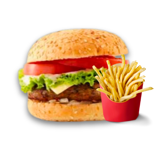 Burger med ost, salat,bbq saus, kebab saus, hvitløk saus, serveres med pommes.