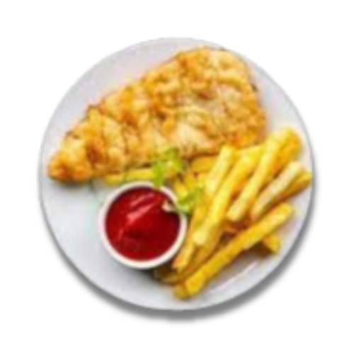 (inneholder G.S) Fiskefilet med pommes bistro, salat bbq saus, hvitløk saus.